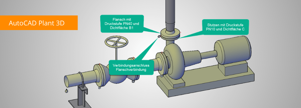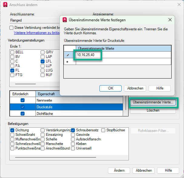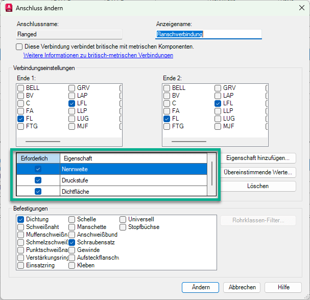 AutoCAD Plant 3D unterstützt den Anwender beim Erstellen von Verbindungen mit Hilfe von übereinstimmenden Eigenschaften. So wird etwa bei Verwendung einer Flanschverbindung überprüft, dass Nennweite, Druckstufe und Dichtfläche übereinstimmen. Weitere Eigenschaften lassen sich hinzufügen.