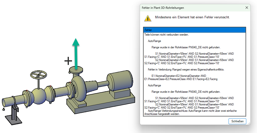 Vor dem Erstellen der Rohrleitung am Druckstutzen wurde die Rohrklasse PN040_DE (PN40, Dichtfläche B1) aktuell eingestellt. Daher wird beim Ausführen des Leitungsverlaufs ein Konflikt bzgl. abweichender Eigenschaften ausgelöst.