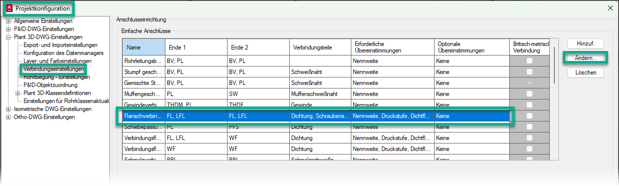 Öffnen Sie die Projektkonfiguration und suchen Sie unter Plant 3D-DWG-Einstellungen die Verbindungseinstellungen: