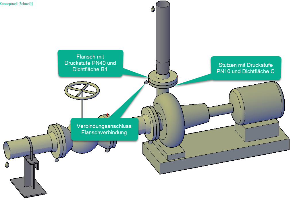 Dies hilft dem Anwender, Konflikte etwa der Druckstufe zu vermeiden. In nachfolgendem Beispiel wurde bei einer (Bestands-) Pumpe Saug- und Druckstutzen mit Druckstufe PN10 und Dichtfläche C konfiguriert. Die Rohrleitung am Saugstutzen wurde über die Rohrklasse 10HC01 (PN10, Dichtfläche C) erstellt. Daher ergab sich kein Konflikt und es wurde ein Anschluss erzeugt.