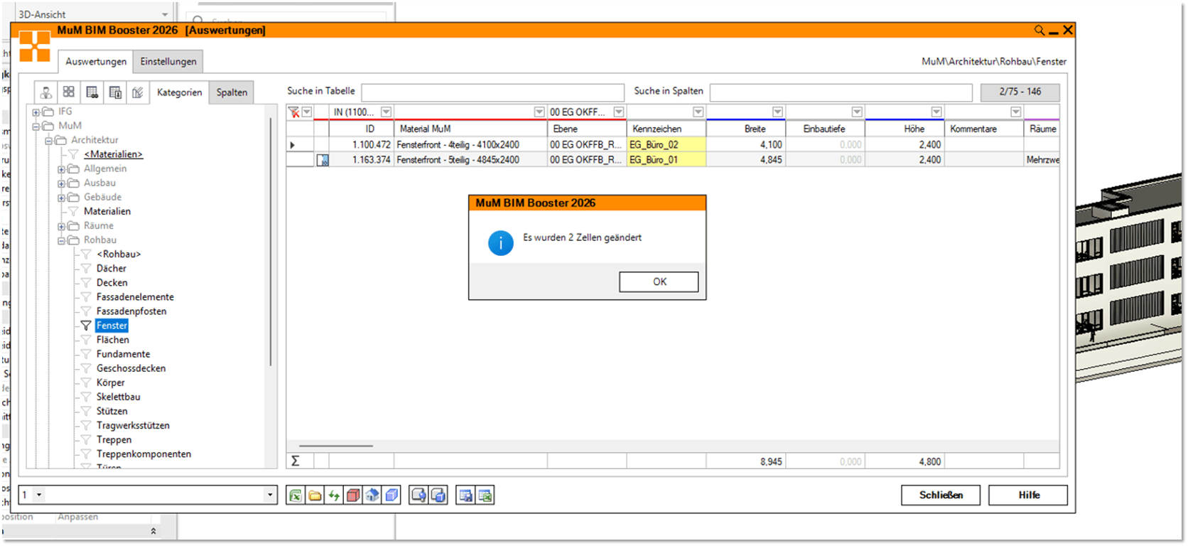 Für die Projektarbeit verfolgen wir in der Planung den Ansatz, auch die Projektinformationen am 3D-Modell abzubilden. Hier ermöglichen wir diese Tätigkeit mit dem BIM Booster der Mensch und Maschine. Neben einem Export haben wir im BIM Booster auch den Weg eines Imports abgebildet. Daher ist unsere Exportierte und ggf. in Teilen optimierte Excel-Liste die Grundlage für den Import. Der Import selbst wird über 3-Klicks erledigt, von einem zeitlichen Aufwand kann man also nicht sprechen.