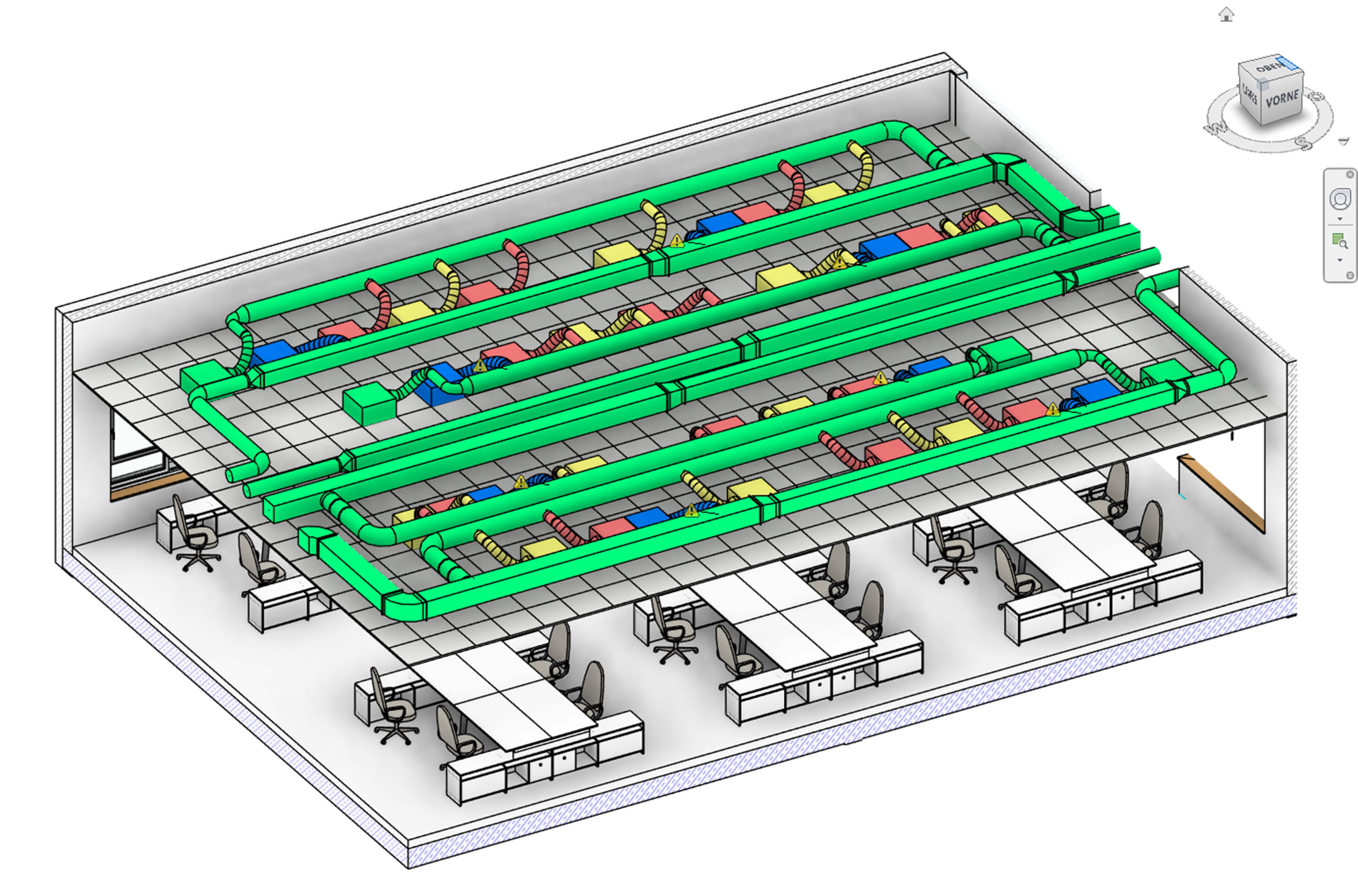 Neubau-Elemente sind Bauteile, die im Zielzustand des Projekts vorhanden sein sollen – z. B. neue Raumstrukturen, Tragkonstruktionen, Verteilerschränke, Kanalsysteme, Rohrnetze oder Kabeltrassen. Sie sind in Revit sauber von Bestands- und Abbruchelementen getrennt, was insbesondere für Mengenermittlung und IFC-Export entscheidend ist.
