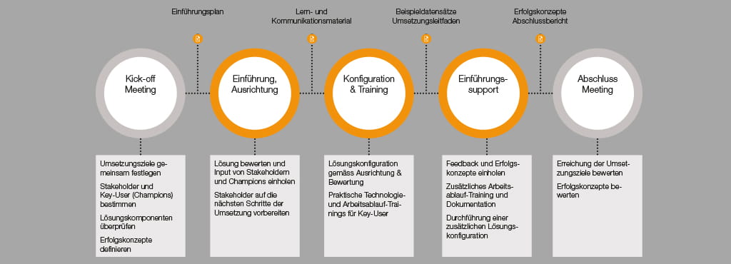 Abgeleitet von der SCRUM Methode zur effizienten Umsetzung von Projektzielen, haben wir ein Umsetzungskonzept entwickelt, über das Technologien zusammen mit neuen Prozessen erfolgreich eingeführt werden können. Vorbereitete Dokumente und Unterlagen zur Schulung führen durch einen klaren Umsetzungsprozess. Ein Berater steht während der gesamten Dauer der Implementierung für Schulung, Prozessberatung und Support zur Seite. Am Schluss werden die Ziele und Resultate verglichen, um damit den Erfolg der Umsetzung zu messen.