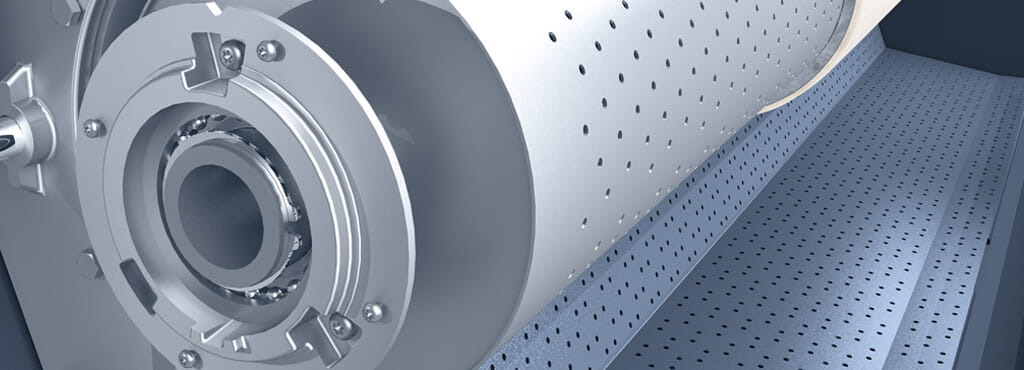 Gruppenleiter Axel Schwarz und präsentiert den Blick in eine Professional-Mangel mit Einsicht in die langlebige Technik des Gerätes.