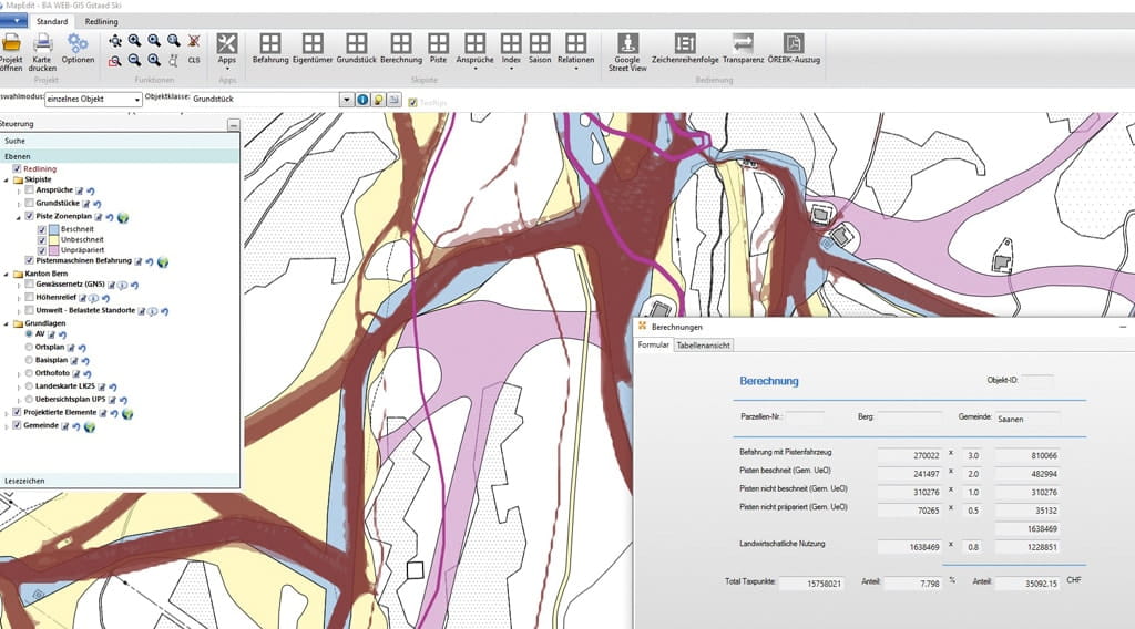Das Abrechnungsteam hatte bisher komplexe Exceltabellen entwickelt, um die Entschädigungen zu ermitteln. Doch man suchte ein einfacheres Tool und wollte gleichzeitig eine zentrale, einheitliche Ablage einführen, um die Vielzahl der Daten zeitgemäß verwalten zu können. Im Gespräch mit dem zuständigen Vermessungsbüro, der Baumann Vermessungen AG aus Saanen, wurde klar, dass ein geografisches Informationssystem helfen könnte. Zusammen mit dem GIS-Dienstleister RSW AG entwickelte man eine passende, erstaunlich einfache Lösung, die GIS-Daten aus einer Oracle-Datenbank nutzt und die Berechnungsergebnisse über MuM MapEdit grafisch und numerisch darstellt.